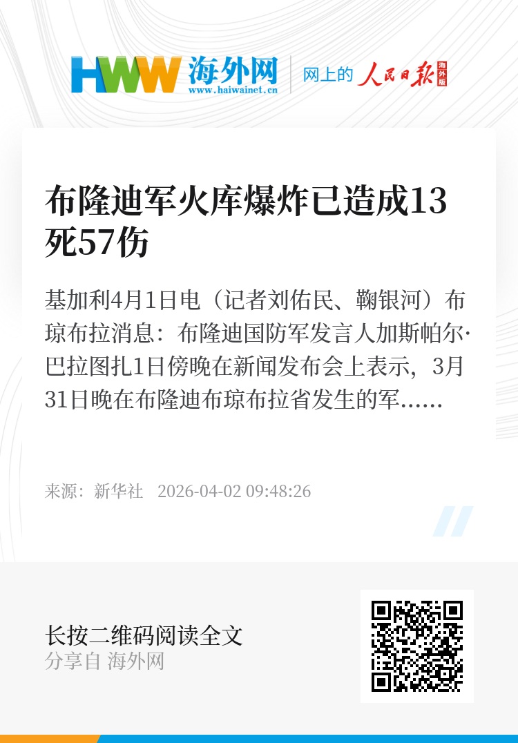 新华社基加利4月1日电(记者刘佑民、鞠银河)布琼布拉消息:布隆迪国防军发言人加斯帕尔·巴拉图扎1日傍晚在新闻发布会上表示,3月31日晚在布隆迪布琼布拉省发生的军火库爆炸事件已造成至少13人死亡、57人受伤。