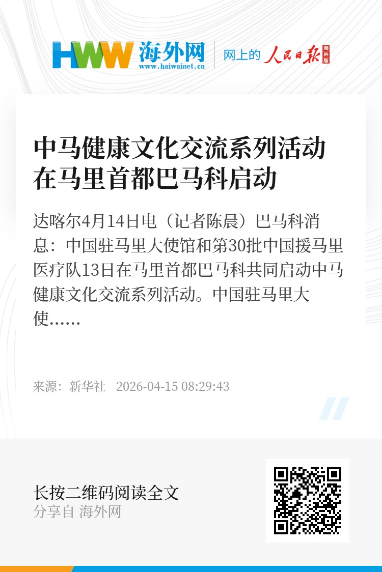 新华社达喀尔4月14日电(记者陈晨)巴马科消息:中国驻马里大使馆和第30批中国援马里医疗队13日在马里首都巴马科共同启动中马健康文化交流系列活动。