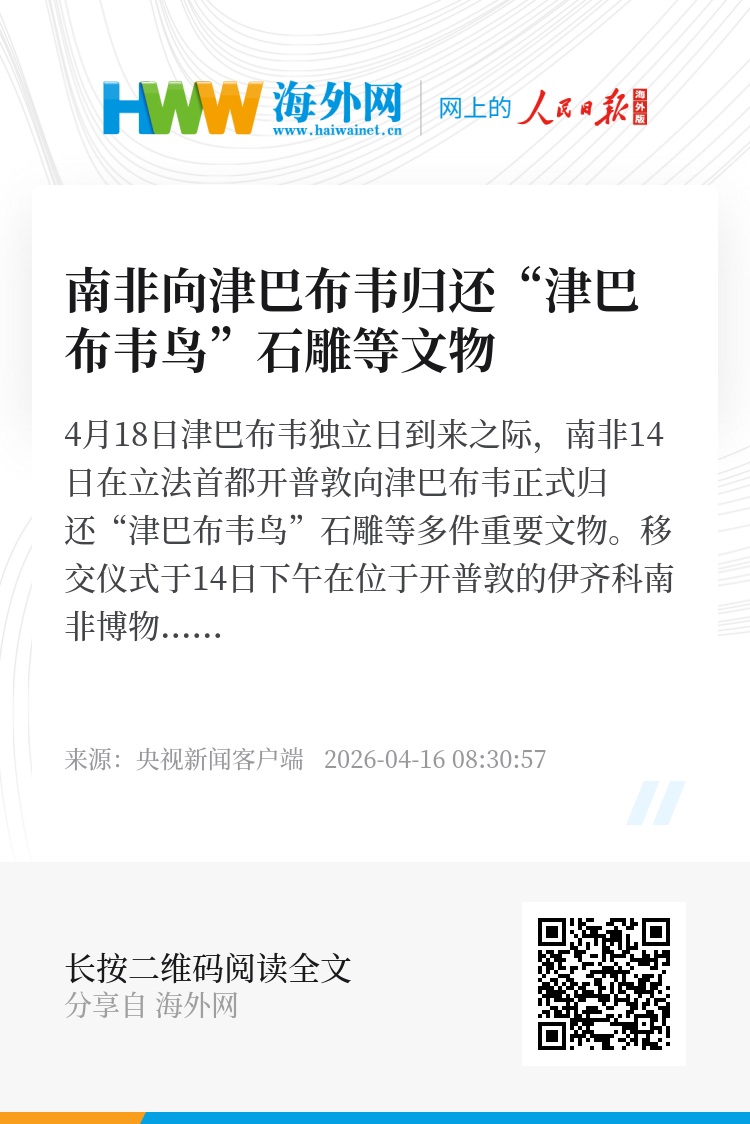 4月18日津巴布韦独立日到来之际,南非14日在立法首都开普敦向津巴布韦正式归还“津巴布韦鸟”石雕等多件重要文物。