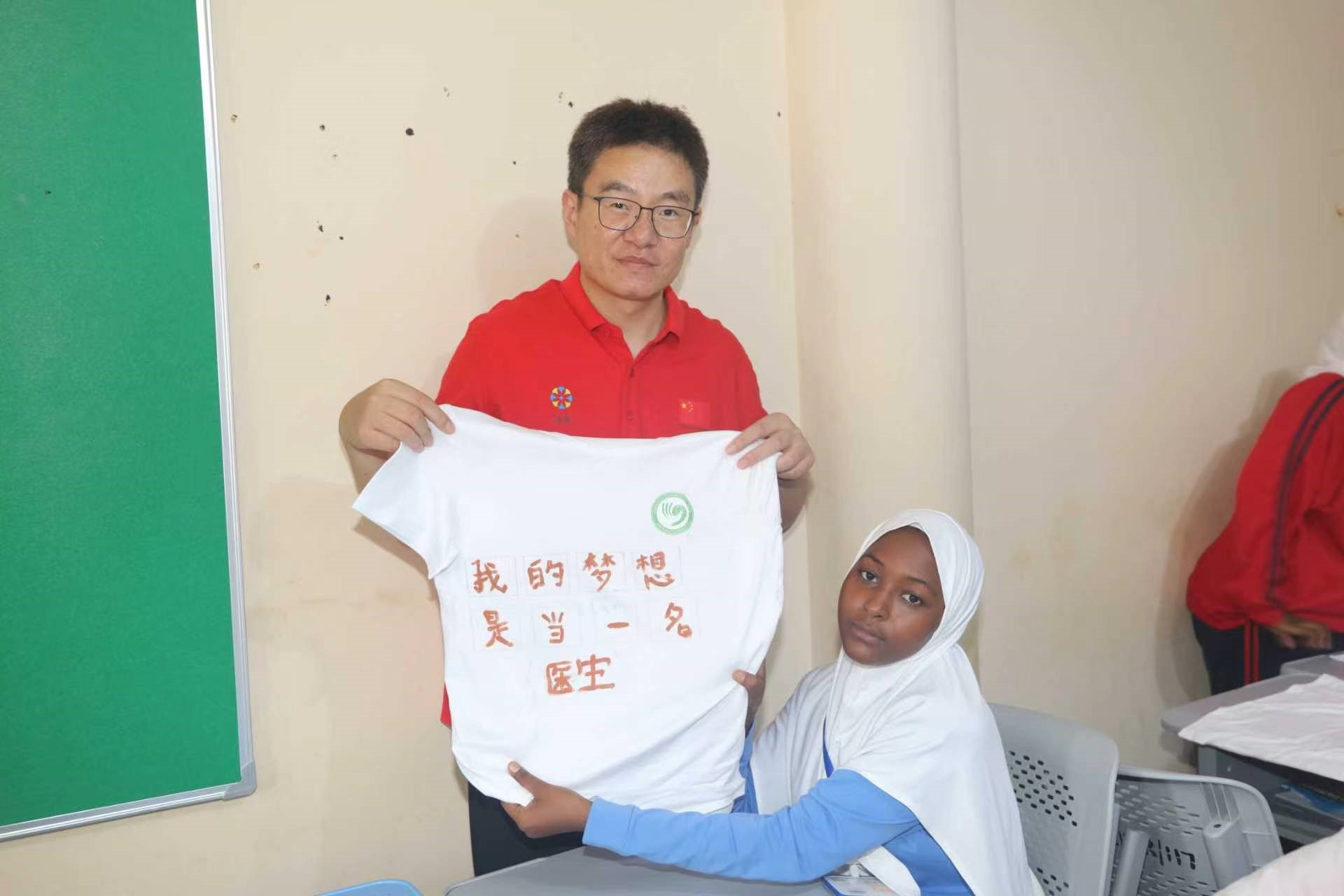 首场活动在里拉学校中学部展开。医疗队队员与28名当地学生共同参与T恤彩绘与灯笼彩绘体验。中文老师带领学生学习“我的梦想是当一名……”的汉字书写与拼音发音;随后,医疗队员分组融入学生中间,纠正汉字笔顺,倾听他们对未来的憧憬,分享医疗队的故事。互动中,学生们被医疗队员的奉献精神打动,纷纷询问“医生”“健康”“希望”等汉字的写法;有的学生还精心绘制了听诊器、爱心等图案,将对医学的向往与对中国的友好融入创作。