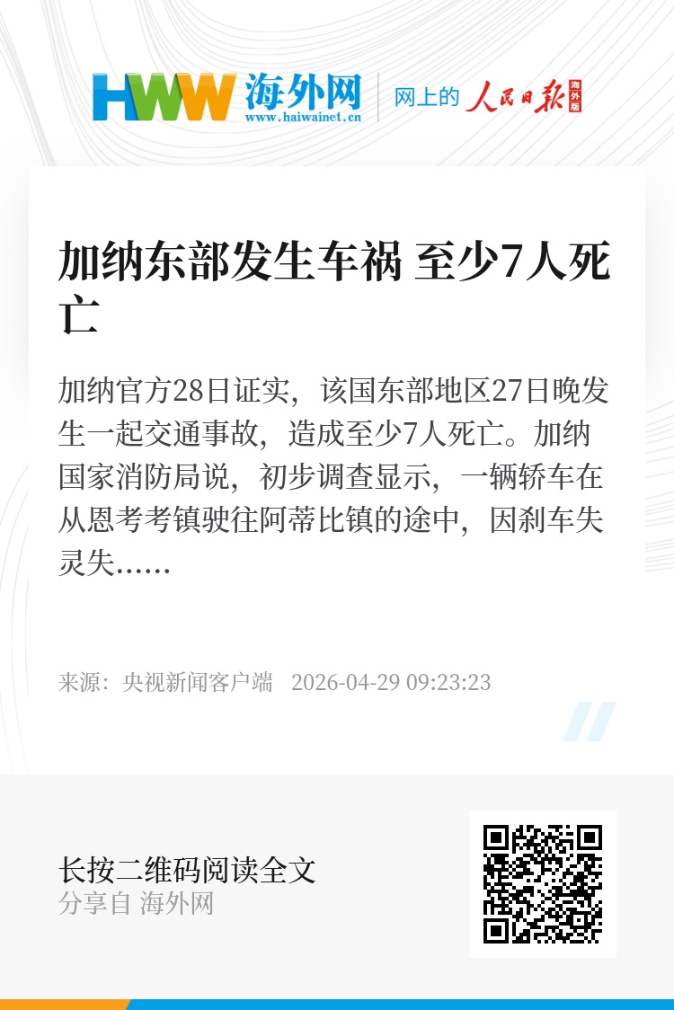 加纳官方28日证实,该国东部地区27日晚发生一起交通事故,造成至少7人死亡。